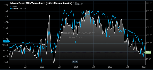 From January 2019 through the first two weeks of January 2023 companies have booked container imports nearly in sync with asking for domestic truckload capacity over the past four years. As inventories correct, that is changing. But their direction remains similar entering ’23.