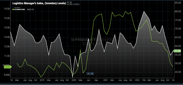 The Logistics Managers’ Index (LMI) inventory level component increased from 55 to 57 from November to December, indicating inventory growth accelerated for the first time since the summer. Meanwhile, trucking demand as measured by the Outbound Tender Volume Index fell. We’re seeing an early sign that demand for goods is eroding faster than companies were expecting.